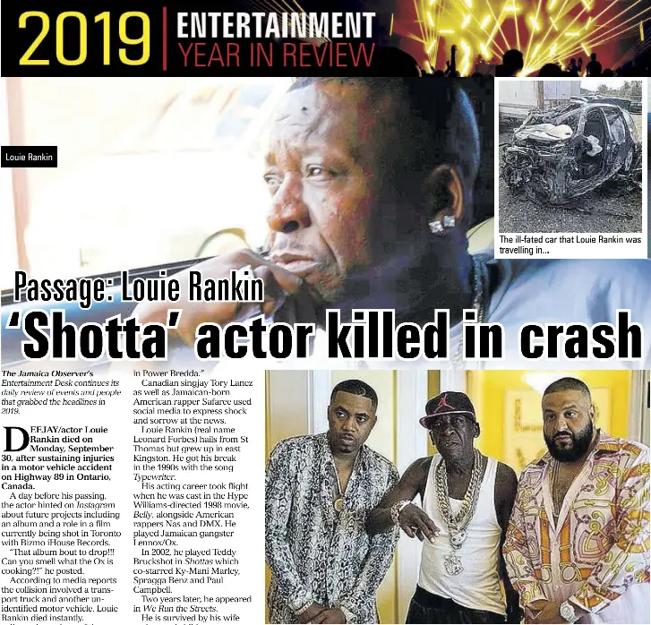 Louie Rankin a Jamaican part-time actor who appeared in films including Belly and Shottas and had a dancehall with Typewriter died Monday in a car crash in Eastern Canada local police said. Ontario Provincial Police said the car Rankin was driving collided with a transport truck near the town of Shelburne. Shortly after 9 am.